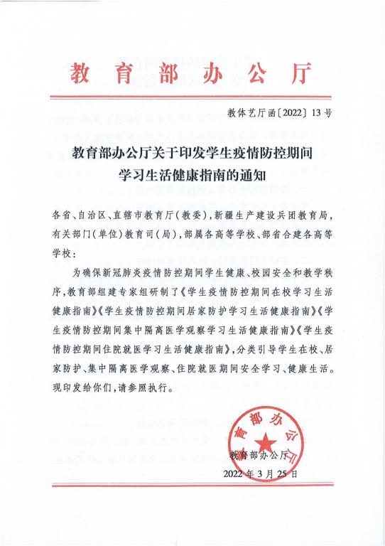 教育部办公厅关于印发学生疫情防控期间 学习生活健康指南的通知