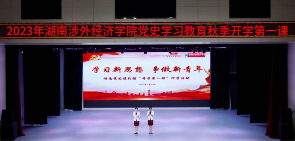 9月19日下午,beat365官网党史学习教育秋季《开学第一课》于音乐厅开展。湖南党史陈列馆馆长朱习文,校党委副书记、副校长汪东明,校党委组织部部长李方圆,人文艺术学院党总支书记廖立彬及各学院党总支副书记、学生党员代表出席活动。