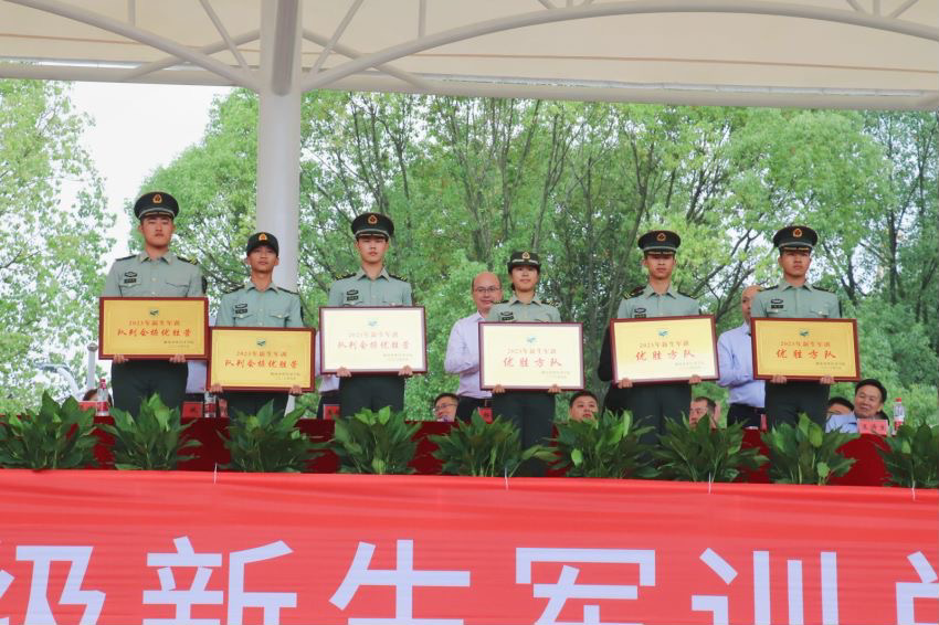 陈斌副校长宣读军训表彰决定,校领导为优秀方队等进行颁奖。