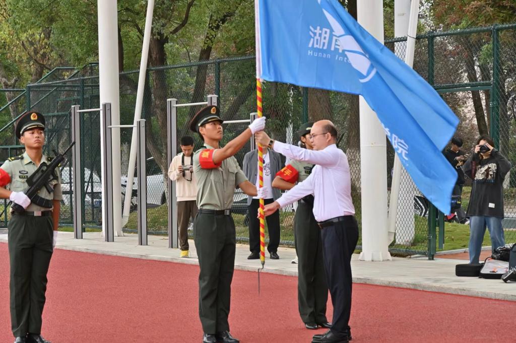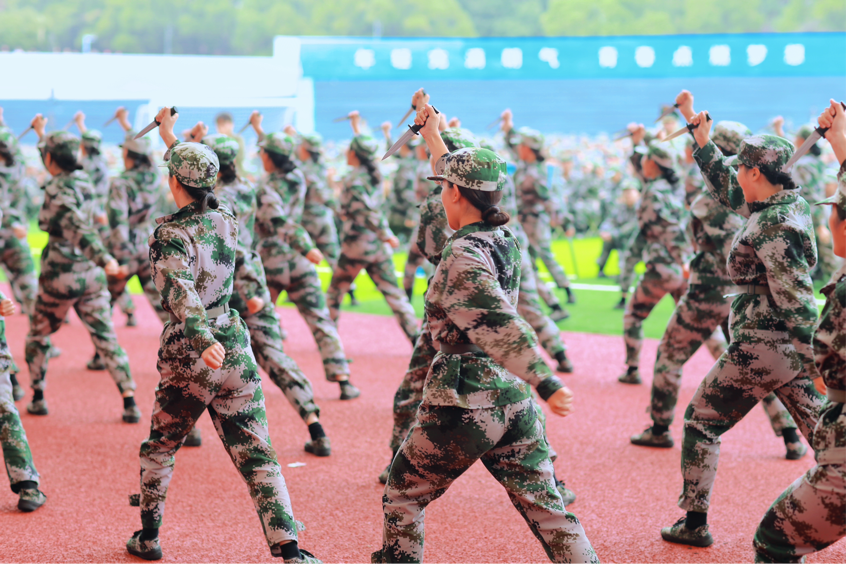 首先举行的是2023级新生军训检阅暨总结表彰。学校党委书记杨念向军训团长授校旗,校长王耀中检阅军训方阵,随后便是精彩的分列式和军体拳操汇报表演。各营(二级学院)方阵迈着整齐稳健的步伐,昂首挺胸、精神抖擞地通过主席台。分列式结束后,由男生演示的军体拳和由女生演示的匕首操依次上场,赢得全场阵阵掌声。