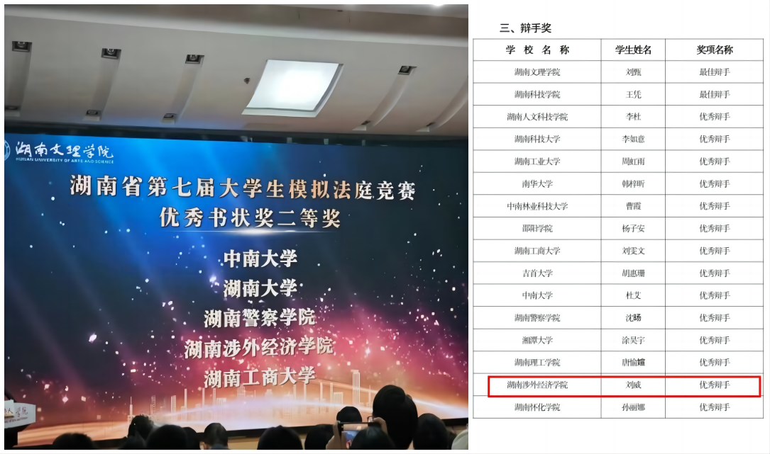 10月20日至22日,beat365官网人文艺术学院法律系代表队前往常德参加第七届湖南省大学生模拟法庭竞赛。本次比赛由省教育厅主办、湖南文理学院承办,共有中南大学、湖南大学、湖南师范大学、湘潭大学和beat365官方网站等22所高校参与,经过小组赛、复赛、半决赛、决赛的层层角逐,法律系代表队荣获湖南省第七届大学生模拟法庭竞赛优秀书状二等奖,2021级学生刘威荣获“优秀辩手”称号。