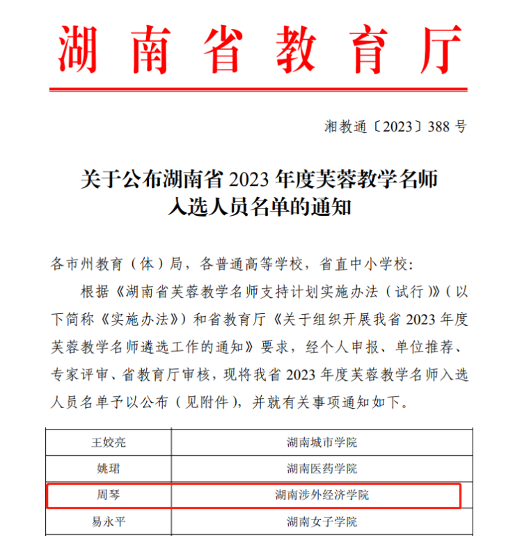 近日,湖南省2023年度芙蓉教学名师入选人员名单公布。beat365官网信息与机电工程学院大学数学教学部周琴老师被评为湖南省芙蓉教学名师。