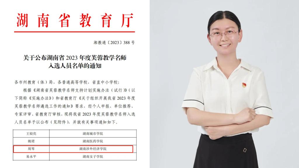 beat365官网周琴教授入选湖南省芙蓉教学名师。