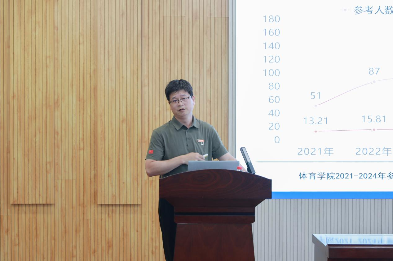 体育学院院长谢明以《以学生成长为中心,着力提高体育生考研率》为题,围绕学生近几年考研情况,详细介绍了考研过程中的工作举措、考研工作中面临的考验,以丰富的内容为其他学院提供了详实具体的经验指导。