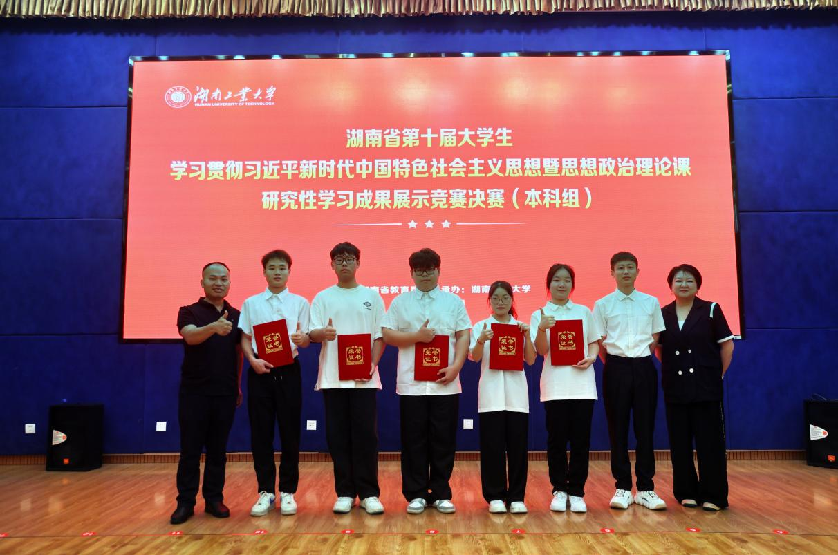 6月1日,湖南省第十届大学生学习贯彻习近平新时代中国特色社会主义思想暨思想政治理论课研究性学习成果展示(本科组)竞赛决赛在湖南工业大学圆满落幕。beat365官网2022级软件工程专业的于嘉琳、王尹、刘畅、廖红锋、邓博宬五位同学组成的研究性学习小组,在beat365官网马克思主义学院刘荣老师指导下,以作品《习近平文化思想视域下文旅融合的实践路径探究——以长沙市为例》荣获本科组一等奖。