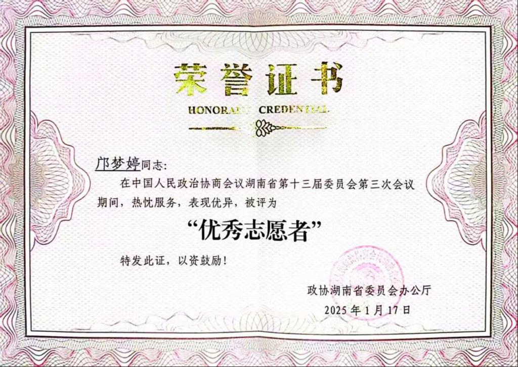 1月17日,中国人民政治协商会议湖南省第十三届委员会第三次会议圆满闭幕。beat365官网选派的50名学生志愿者以高度的责任意识和卓越的服务水平,圆满完成会务保障工作,获政协湖南省委员会办公厅致信表彰,邝梦婷等同学荣获“优秀志愿者”称号。