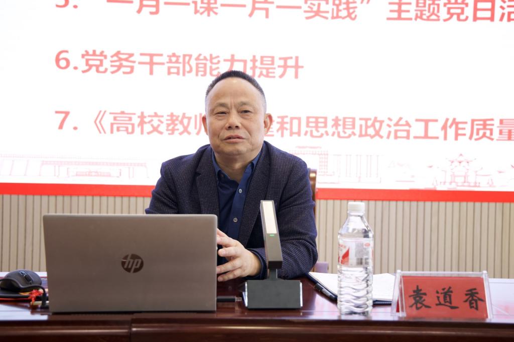 培训会上,袁道香教授作了《关于高校基层党建几项具体工作的思考》专题讲座。他围绕高校党建“一融双高”、 “双创”工作、党建特色品牌创建、基层党组织活动创新、“一月一课一片一实践”主题党日活动、党务干部能力提升以及《高校教师党建和思想政治工作质量标准(试行)》七个方面,系统阐述了新时代高校基层党建工作的重点要点和工作依据,对如何开展好基层党建工作进行了详细讲解。