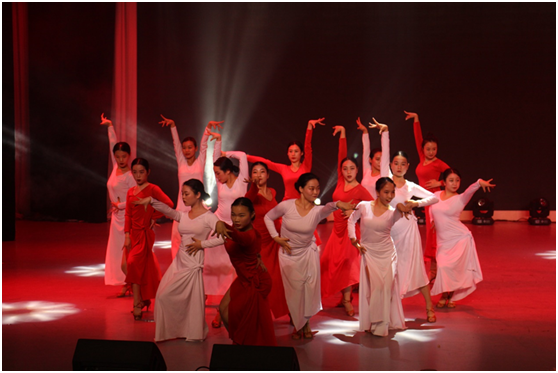 现代舞《红与白》中舞者红色与白色的身影在舞台上来回飘转,宛如一只只飞舞的蝴蝶。