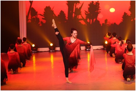 《中国舞技巧展示》,舞蹈表演班的同学们以血与火的舞台画面为背景,伴随着音乐《九儿》舞动旋律,将先辈们为革命赴汤蹈火的壮举演绎得淋漓尽致,感染着在座的每一位师生,涤荡人的灵魂,同时也展示出了同学们高难度的中国舞技巧。
