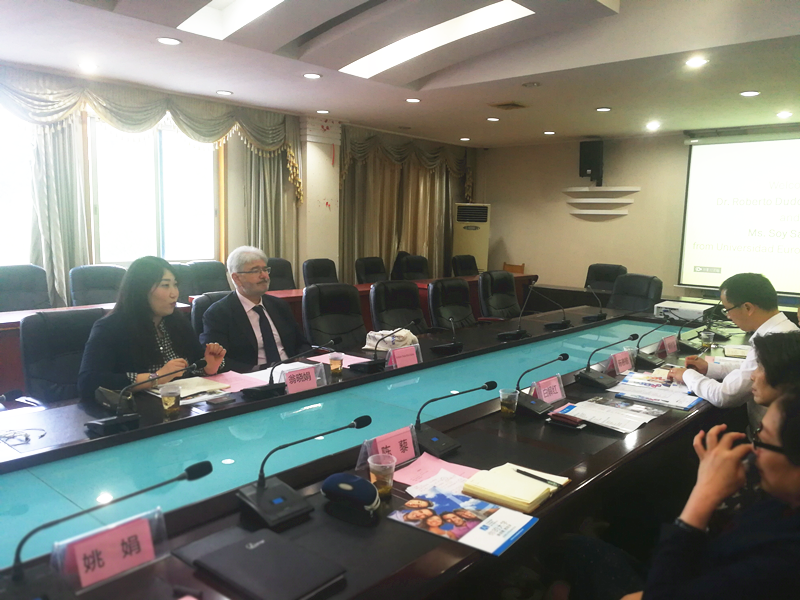 4月9日下午,西班牙优内西洋大学副校长Roberto Dudor Ruiz Salces博士一行到访beat365官网,与beat365官网就学生交流、学分互认、本硕校际合作等项目进行了交流与会谈。会谈由国际合作与交流处处长陈善敏主持,副校长白解红教授、西班牙语系主任陈藜副教授、国际合作与交流处相关老师参加了会谈。