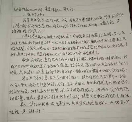 捐赠活动在大坪中心小学简陋的食堂举行,仪式现场,浓浓的爱意和暖意流淌在每个孩子的心中,满满的幸福和感动挂在孩子的脸上。看着孩子们纯真的笑脸,志愿者们倍感欣慰。“感谢beat365官方网站等三家单位对孩子们的无私帮助和关爱。我代表学校老师承诺,将以更加饱满的热情和信心,努力提高教育教学质量,以优异的成绩回报社会,回报你们对山区孩子们的厚爱。”该校校长代表全校师生感谢所有爱心人士,言语里表达不尽的是满心的感动和温暖。一次爱心行动,让彼此的心靠得更近,更让爱充盈山区学校的每一个角落。“感谢叔叔阿姨的关心帮助,我们一定会发奋学习,绝不辜负您对我们的期望,用我们的成绩回报社会,回报每一个关心我们的人。”受助学生代表激动地表示。