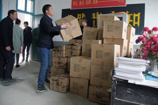 师生高兴的搬运爱心物资
