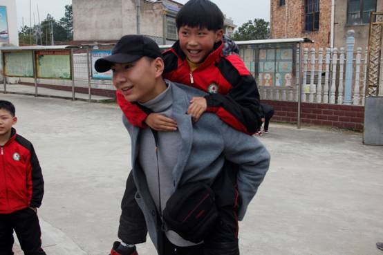 兴奋的孩子跳上至美支教老师的背