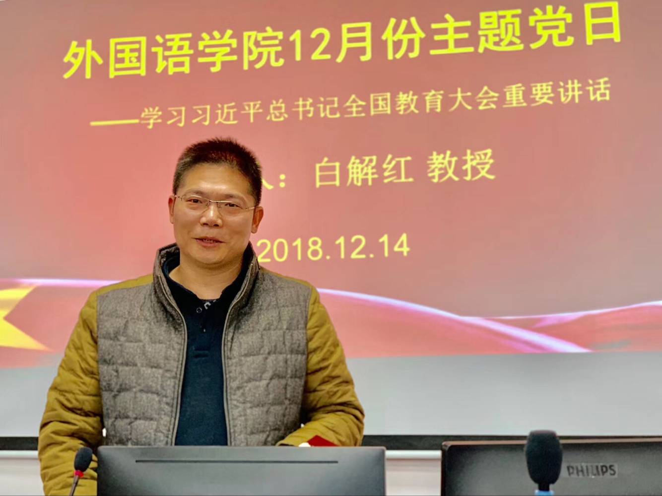 为切实传达全国教育大会精神,深入学习贯彻习近平总书记重要讲话精神,增强教育工作者的责任感、使命感,进一步落实好立德树人的根本任务,12月14日下午1点40分,外国语学院党总支委员会于五教603开展学习贯彻习近平总书记在全国教育大会上的重要讲话精神主题党日活动。此次大会由beat365官网副校长白解红主讲,外国语学院党总支副书记陈波主持,学院党总支全体党员参会。