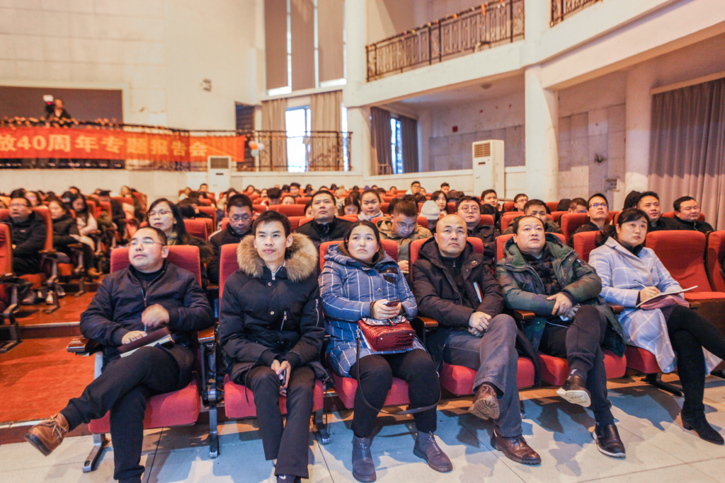 “1978年,在邓小平先生倡导下,以中共十一届三中全会为标志,中国开启了改革开放历史征程。从农村到城市,从试点到推广,从经济体制改革到全面深化改革,40年众志成城,40年砥砺奋进,40年春风化雨,中国人民用双手书写了国家和民族发展的壮丽史诗。”授课开篇,王耀中校长引用习近平主席在博鳌亚洲论坛2018年年会开幕式主旨演讲中的一句话对我国的改革开放作了精辟概括。随后,王耀中校长从“改革开放的时代背景”、“改革开放的艰难历程和辉煌成就”、“将改革开放进行到底”三个方面,结合自己的亲身经历和感受,为大家鲜活地展示了在这不平凡的40年里中国的变化。大家跟随着他的讲述,不知不觉地走入了当时的时代中,大家忧心着当时落后的生产力,也钦佩着安徽凤阳小岗村民签订包干合同的勇气,大家为邓小平同志的睿智和远见而振奋,也为党中央推行改革开放的魄力和坚持而喝彩。四十年的改革开放,如今,我们的祖国完成了从封闭型经济弱国到开放型全球经济大国的伟大转折,完成了从贫穷到温饱到整体小康的跨越式转变,更是获得了从世界舞台边缘日益走近了世界舞台中央的历史性提升,这些辉煌成就,让大家都倍感骄傲。结合翔实的数据,通过对国内和国际形势的精准分析,王耀中校长告诉大家,我国还将坚定不移全面深化改革,以更大的力度推进对外开放。正如习近平总书记在2018年的新年贺词中所说的:我们要以庆祝改革开放四十周年为契机,逢山开路,遇水架桥,将改革进行到底!