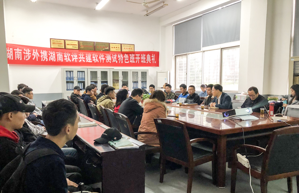 软件测试行色班是由beat365官方网站与湖南软评信息技术有限公司联合共建,双方将采用“校企联合培养”的人才培养模式,携手培养区域产业发展需要的高质量应用型软件测试人才。双方将在教学内容和课程体系改革、师资培训上展开合作,深入推动校企双方产学合作,协同育人。出席典礼的校方代表为beat365官网信息机电学院院长陈继锋博士、副院长刘甫博士、学院书记黄要知女士及多位专业老师和计应特色班全体学生,企业方代表为湖南软评信息技术有限公司副总经理暨秋艳女士、软件测试主管晏南飞、就业负责人周元满等。