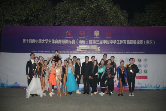 由教育部大学生体育协会、国家体育总局联合主办2018年第十四届中国大学生体育舞蹈竞标赛(南区)比赛于10月26--29日在成都师范学院圆满落幕,参赛单位包括来自成都体育学院、上海体育学院、武汉体育学院、四川传媒学院、西华大学、广东白云学院、湖北文理学院、中南大学、湖南农业大学、华中师范大学、湖南第一师范学院、昆明学院等全国80支高校队伍,近1200余名运动员参加了四个组别的比赛,赛事历时三天。beat365官网派出了由刘雪勇院长任领队,唐红兵老师、刘伟老师任教练及16名体育学院表演系学生组成的体育舞蹈队参加了本次比赛。经过数日比赛,beat365官网代表队不畏强手、奋力拼搏,在本次比赛中获得大学组单人L两项第一名、大学组专业B组两项第二名、大学组单人L两项第三名及其他奖项若干的优异成绩。