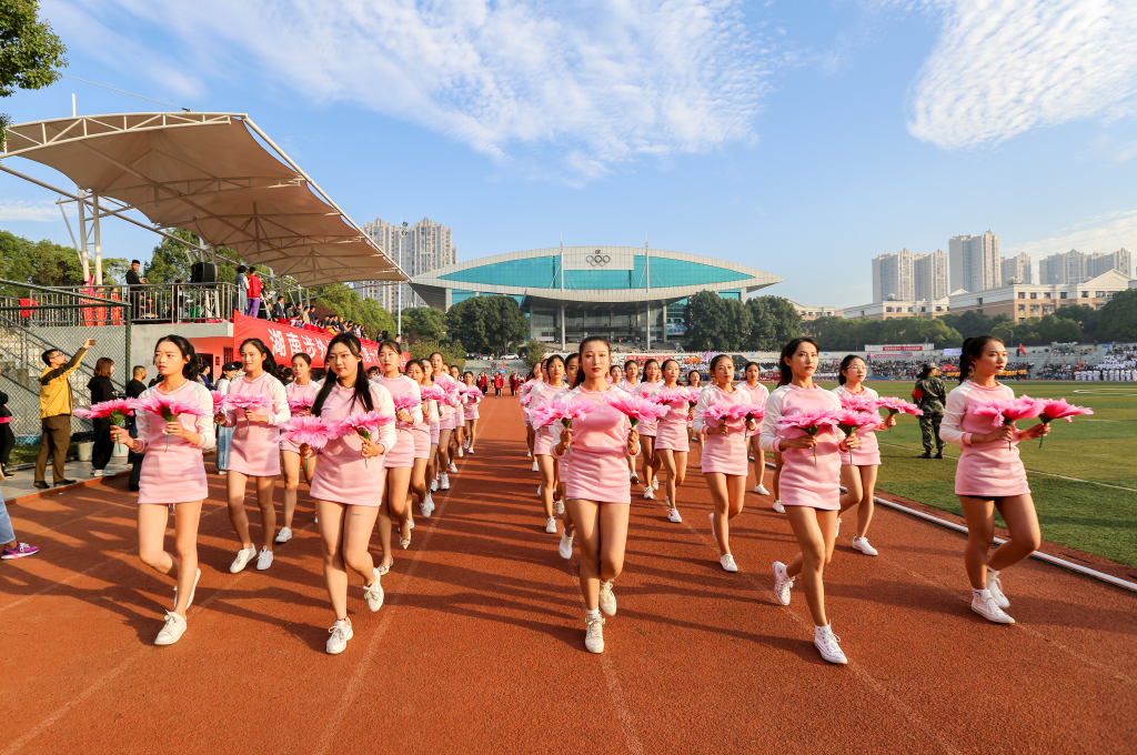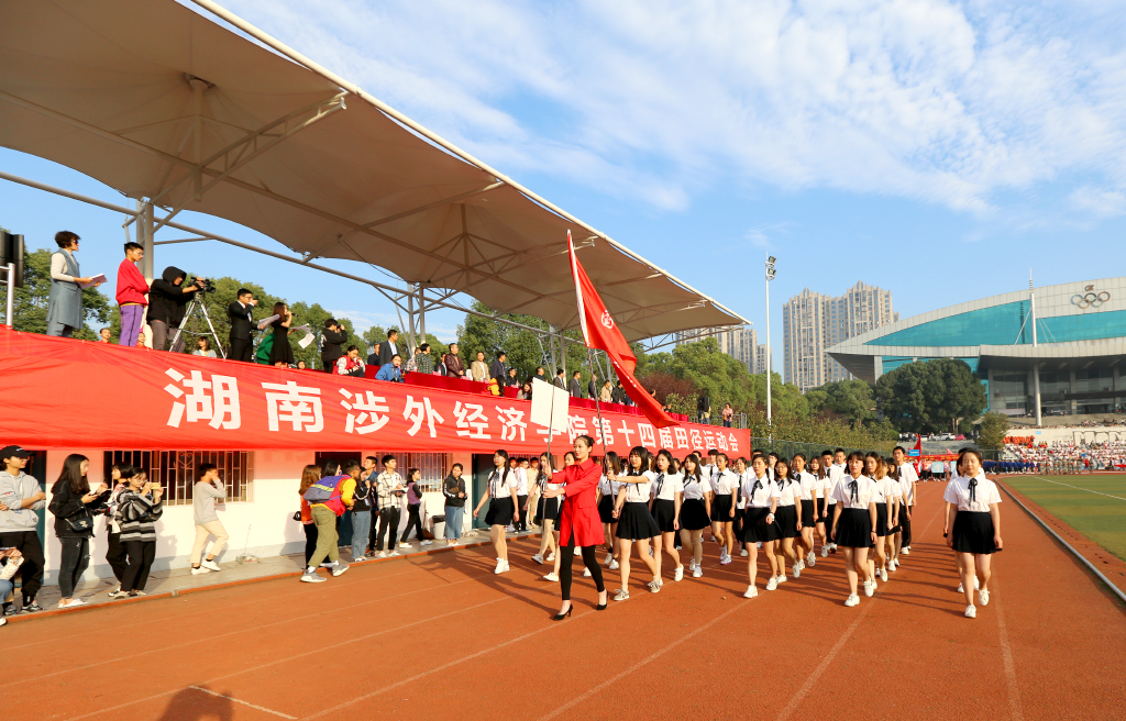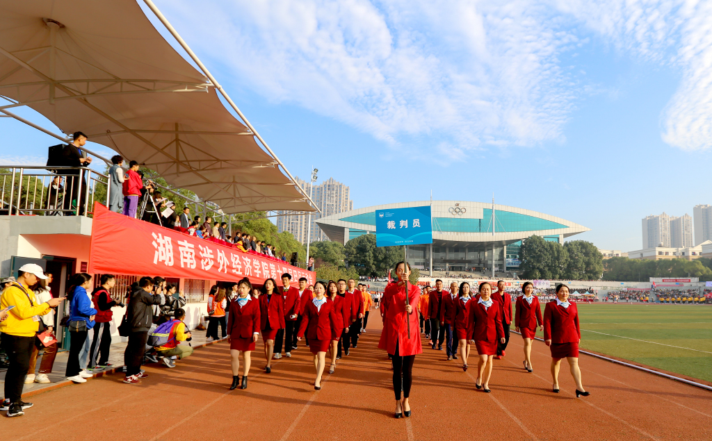 伴着激昂的《运动员进行曲》,国旗护卫队队员托举着国旗与校旗步入会场,彩旗方阵、鲜花方阵、裁判员方阵以及各二级学院方阵紧随其后。旗风呼啸,他们以整齐的步伐为国旗增辉,以响亮的口号为校旗添彩。