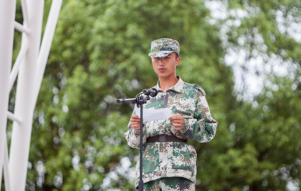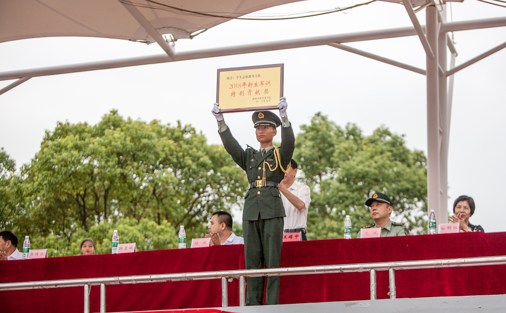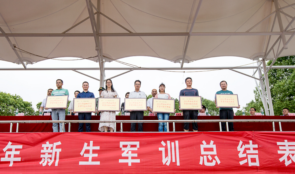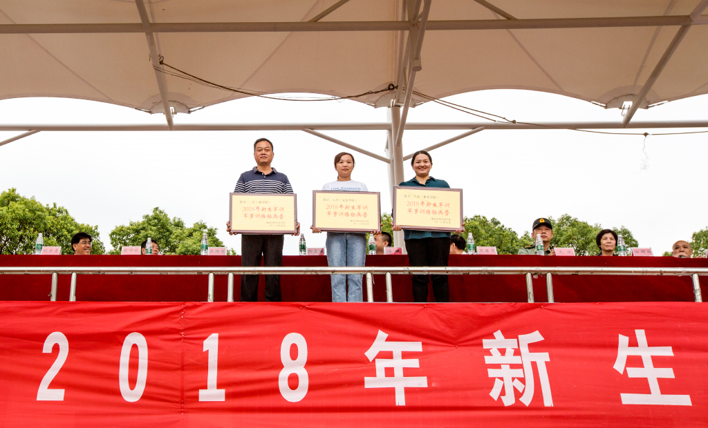 汪东明副校长宣读《关于表彰二〇一八年新生军训先进集体及先进个人的决定》,希望全体师生以他们为榜样,在今后的学习和工作中发扬顽强拼搏的精神,积极进取,不断努力,争创佳绩!