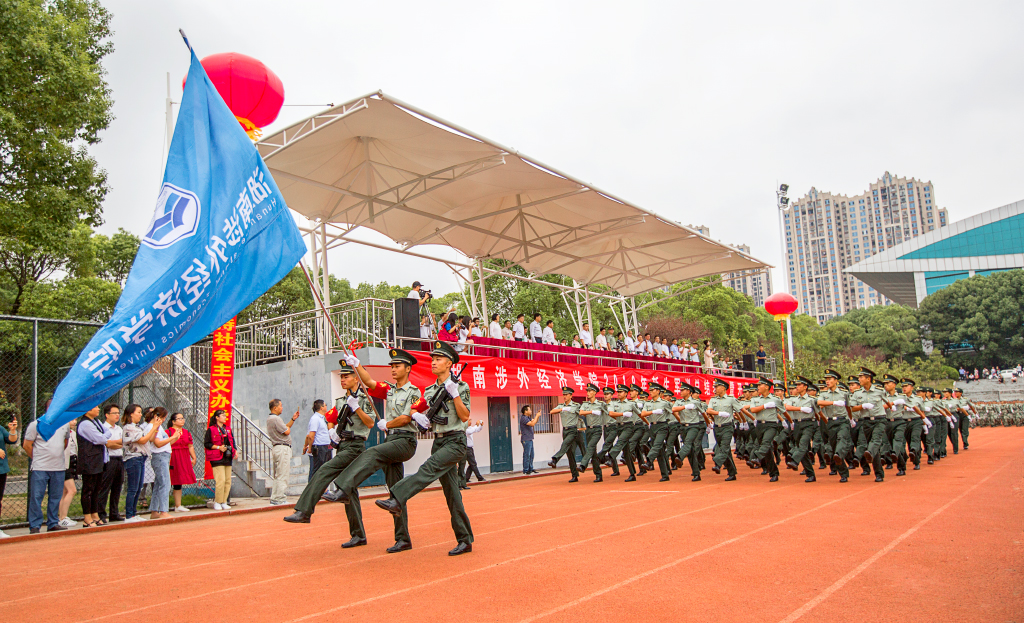 大会在庄严的国歌声中正式拉开了序幕。首先进行的是2017新生军训检阅与总结表彰。陈斌副校长授校旗,王耀中校长检阅方阵,他亲切地向小战士们问候:“同学们好!同学们辛苦了!”,新生们也激动而响亮地回答:“为涉外争光!”。之后是分列式,十多个方阵队迈着整齐划一的步伐依次从主席台下走过,用行动向大家展示着他们军训的成果,嘹亮的口号让整个田径场瞬间变得朝气蓬勃。