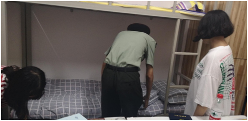 学校为了更好地关爱新生,所有行政人员和专职教师协助学工部门深入学生宿舍,了解学生的思想动态和实际困难,帮助新生解除一切后顾之忧,让新生适应新的生活环境,圆满完成新生军训工作。