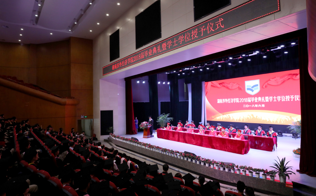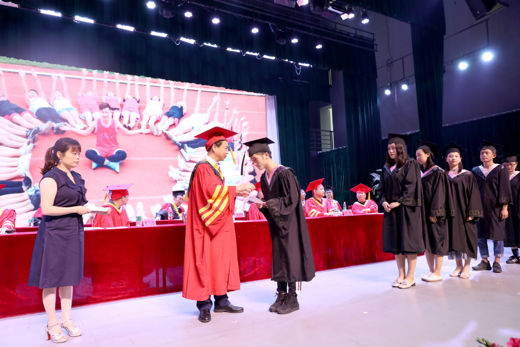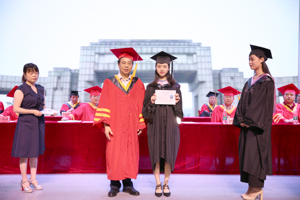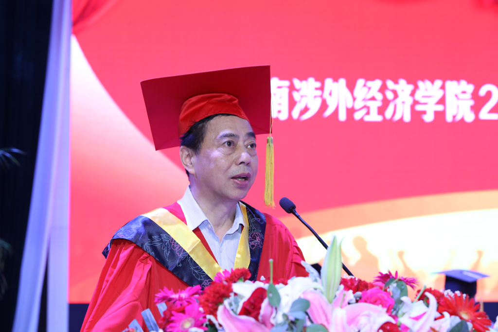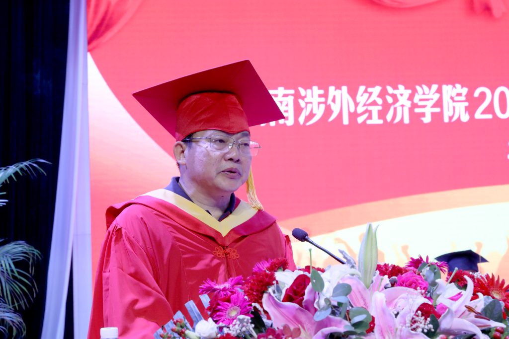 王耀中校长在致辞中对即将离校步入社会的毕业生们表达了深深的祝福。他说:“习近平总书记曾于今年五月在北京大学师生座谈会上说道:幸福都是奋斗出来的,奋斗本身就是一种幸福。这不仅是习近平总书记对北大学子和全国青年的要求和期望,同时也是我对你们的寄语。青年需励志,立鸿鹄志,做奋斗者。为实现中华民族伟大复兴的中国梦而奋斗,是我们人生难得的际遇。每个青年都应该珍惜这个伟大时代,做新时代的奋斗者。譬如我们的优秀学子陈帅峰和杰出校友朱增辉,他们只是数万名奋力拼搏的涉外学子中的一员,但他们的故事揭示着同一个道理——不管你身处人生的高峰还是低谷,命运终究需要掌握在自己的手中。热血澎湃、充满朝气的青春岁月,惟有奋斗方能‘不负韶华不负卿’!”