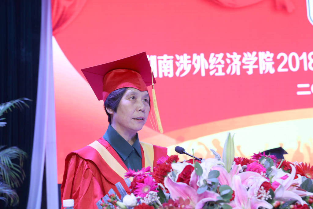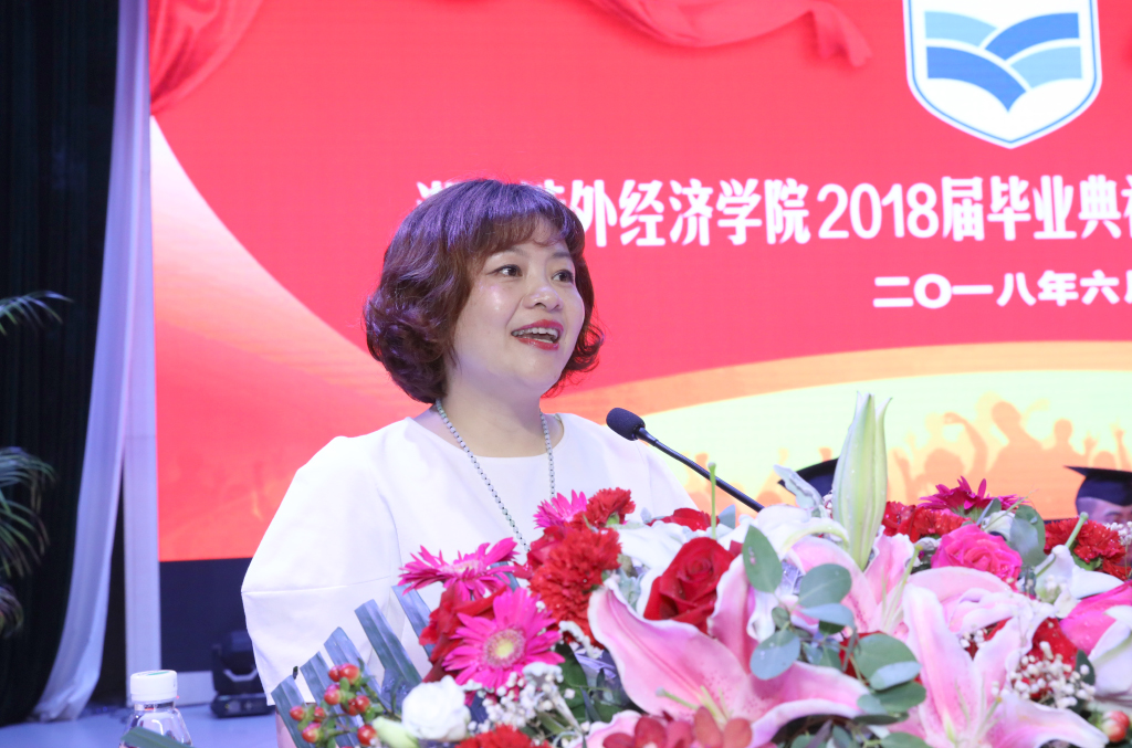 商学院教师杨茜云作为教师代表发言。杨茜云老师给即将踏入社会的学子们提出三条建议:一、正确定位自己,二、做更好的自己,三、保持学习惯性。“此地一为别,孤蓬万里征。希望大家能拥抱生活,享受工作,用梦想照亮前行的方向。”