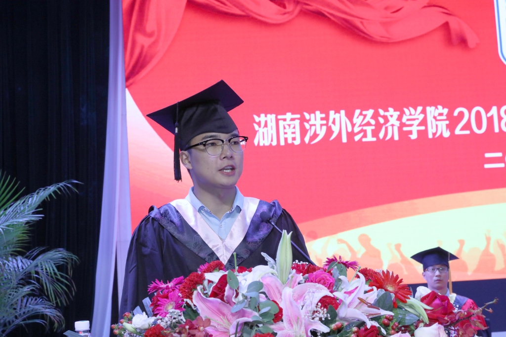 外国语学院毕业生唐军在发言中代表全体毕业生真挚的感谢辛勤付出的教师们,同时也感谢涉外为学子构建的坚实平台,托起学子展翅高飞的翅膀。“在以后的人生征程里,无论我们身处何方,我们都会为自己是涉外人骄傲!”动情的话语激起台下毕业生们的深深共鸣。