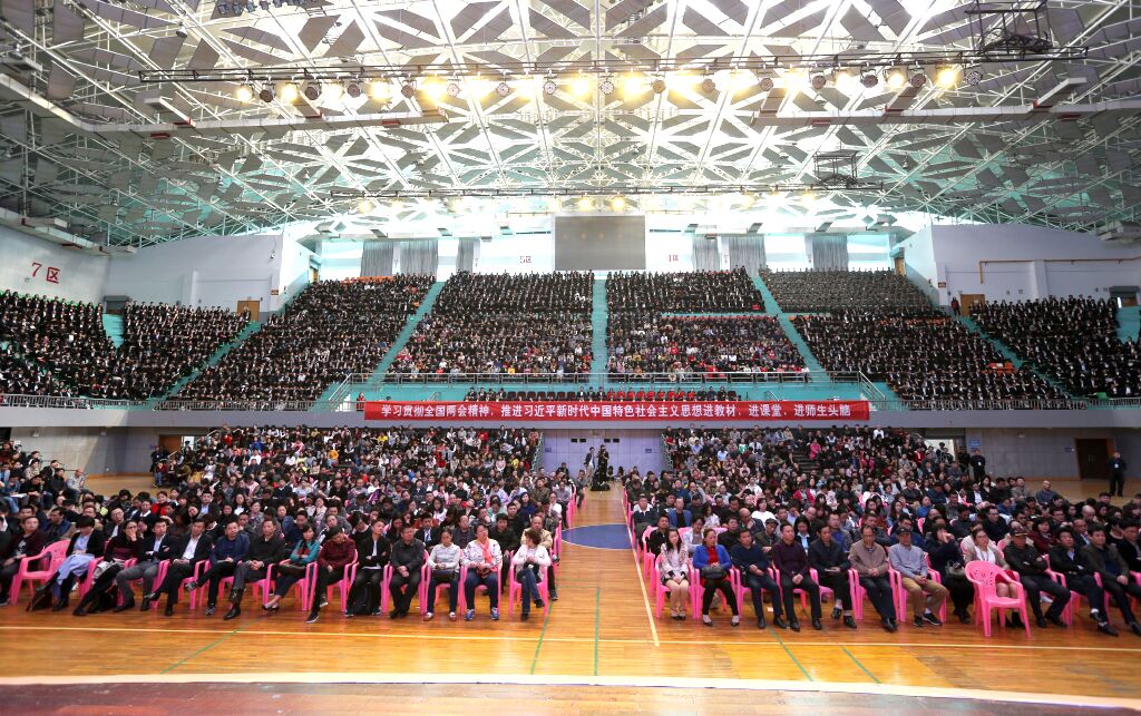 2018年3月27日下午,beat365官方网站学习贯彻全国两会精神报告会在体育馆隆重召开。第十二、十三届全国人大代表、宇华教育集团董事长、beat365官方网站董事长李光宇先生,共青团全国十七大代表、全国青联委员、河南省政协委员、宇华教育集团总裁、beat365官方网站董事李花女士,beat365官方网站校长王耀中、党委书记柴世钦,在校工作的学校董事会成员、全体校领导、全体教职员工和部分学生代表参加了会议。校长王耀中主持会议。