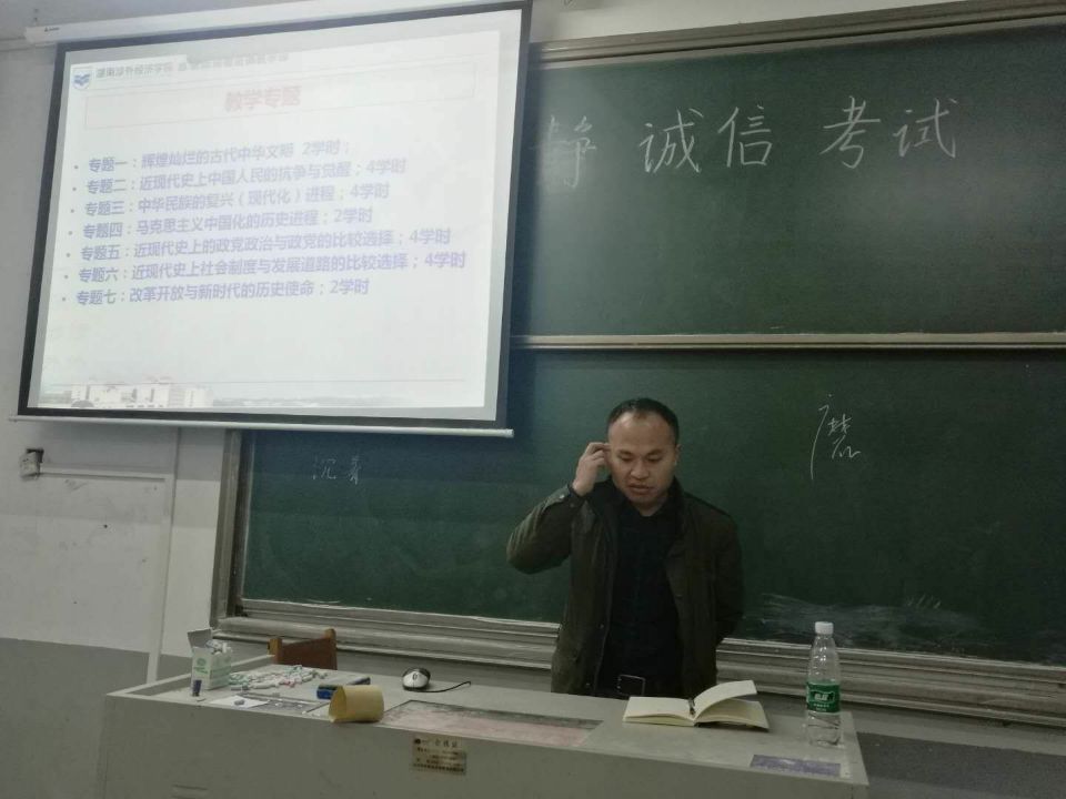 思想品德教研室就本学期把十九大精神和习近平新时代中国特色社会主义思想如何融入“中国近现代史纲要”课程,在内容、方法和输出管理方面展开了热烈讨论。教研室主任刘建中老师首先介绍了“纲要”课程本学期专题设置情况,就每一个专题与十九大精神和习近平新时代中国特色社会主义思想可能的连接点做了分享,并就课程专题一做了比较详细的说课汇报。