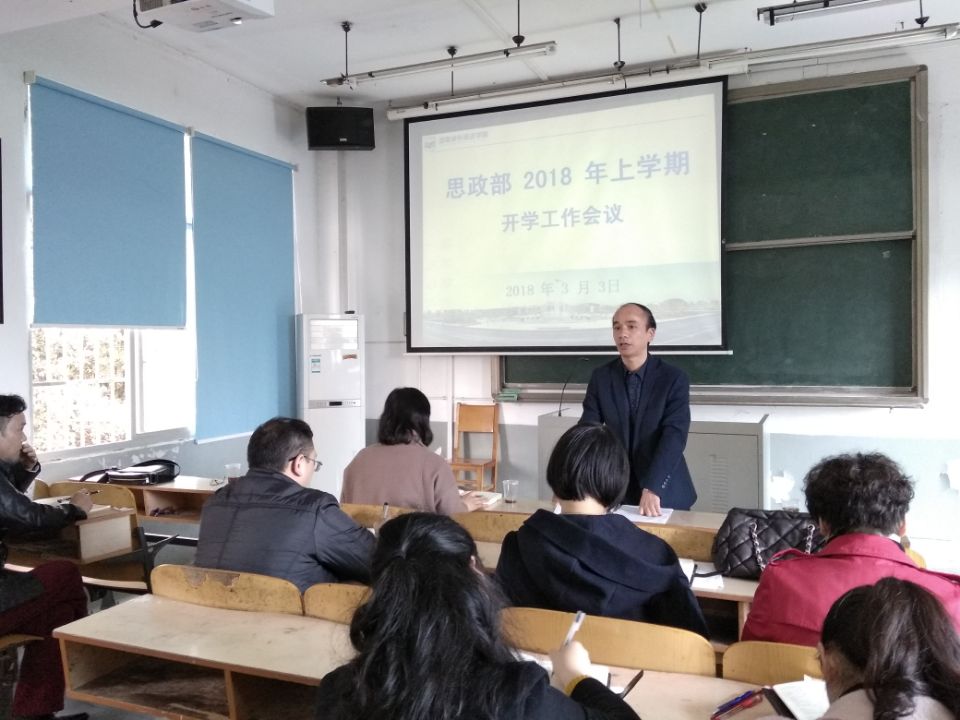 3月3日下午,思政部在1-304教室召开了落实习近平新时代中国特色社会主义思想进教材、进课堂、进师生头脑“三进”工作专题会议,会议由李故新主任主持,思政部全体专、兼职教师参加了会议,鞠晨曦副校长到会指导工作。