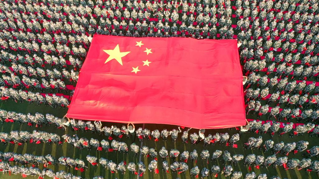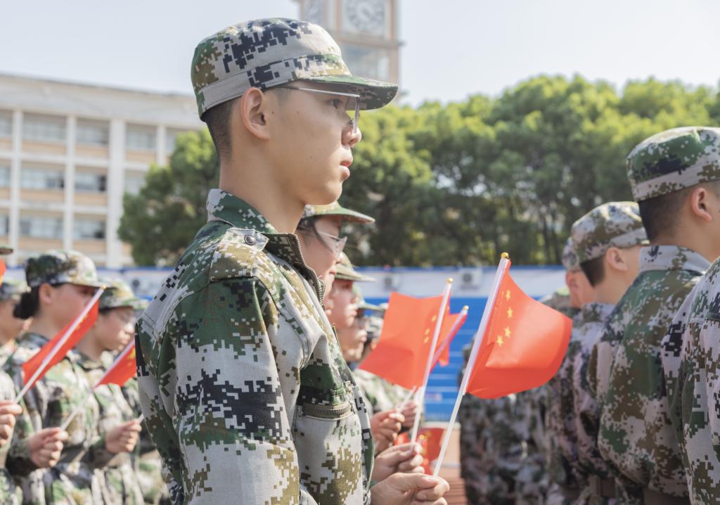 当天下午,数千名军训新生手持国旗,举起展板,变幻出“至善至美”“自立自强”“不忘初心”“砥砺前行”等字样。伴随着《我和我的祖国》激昂的歌声,鲜红的国旗在人群上空缓缓飘过,师生们深情凝望,放声高唱,用青春向祖国表白。