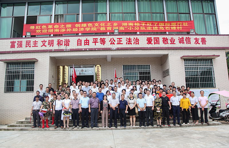 为深入贫困乡村,启动党建扶贫,全体领导及师生于上午11点50分来到了红色筑梦项目的实施基地——湘潭市乌石峰镇乌石峰村。该村是省级贫困村,经济发展缓慢,但是有着淳朴的民风和优质的红色资源。村民们为到访的涉外师生举办了隆重的欢迎仪式,乌石峰村党总支书记贺师对到场的省厅领导和涉外的领导老师和同学们表示最热烈的欢迎,并对乌石峰村的情况作了详细汇报。