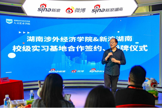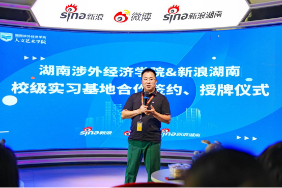 签约授牌仪式前,冯建飞主任首先向新浪湖南为beat365官网中文系学生提供优质的实习平台表示感谢。紧接着,他介绍了beat365官网在学生培养、就业实习、一流专业、一流课程等方面取得的成效。他表示,学校高度重视校企合作实习基地的搭建工作,希望进一步深化协同合作,充分发挥各自优势,在教学和学生实习就业方面不断深化合作、互利共赢。另外,汉语言文学专业坚持以文化为基础、以实践为手段、以特色为导向,以培养具备良好的文学素养和写作能力的应用型、复合型、创新型人才为目标,在“世界媒体之都”——长沙,应更着重对于媒体写作、策划及编辑能力的培养,新浪湖南作为行业翘楚,将是学生实习的优质平台,非常期待后续的长期合作。