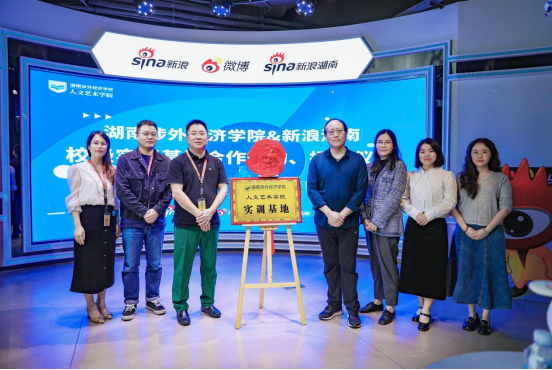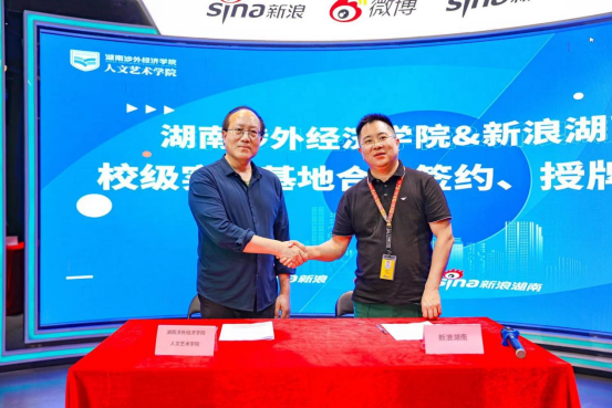 在新浪湖南副总经理聂海贵、副总编辑刘稳波、人事行政部副总监刘婷及相关领导同事的陪同下,冯健飞一行首先听取了新浪湖南企业介绍,并前往演播厅观看企业宣传片,深入了解企业情况。随后,校企合作签约揭牌仪式在新浪湖南演播厅正式启幕。聂海贵副总经理和冯健飞主任作为双方代表,成功签署了校级实习基地协议。协议签署完成后,新浪湖南相关领导与beat365官网中文系教师代表一同为“beat365官方网站人文艺术学院实训基地”揭牌。