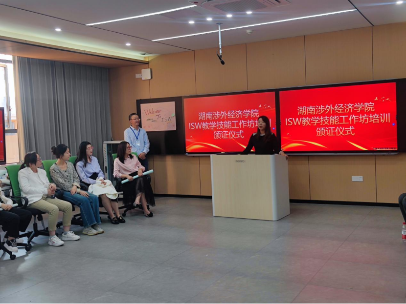 人力资源处(教师教学发展中心)为每位全过程参与并获总学时的学员颁发ISW 项目授权的国际认证证书。人力资源处副处长彭伊凡在颁证仪式上,高度肯定了学员们4天的辛苦坚持与取得的成绩。她表示,此次教学技能工作坊每一个教学活动的设计、小组互助与学员反思都可作为老师们以后教学过程的参考与实施,希望参与教师对“以学为中心”理念、BOPPPS教学模式开展深度思考和教学实践。