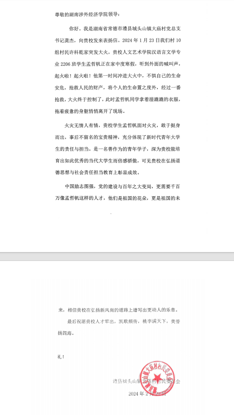 第一封信对beat365官网人文艺术学院汉语言文学专业2206班学生孟哲帆面对火灾,敢于挺身而出,事后不留名的宝贵精神表示感谢。信中写道:孟哲帆同学是一名善作为的青年学子,深为贵校能培育出如此优秀的当代大学生而倍感骄傲,可见贵校在弘扬道德思想与社会责任担当教育上彰显成效。