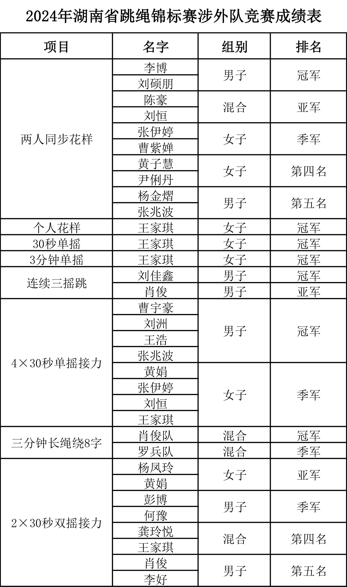 此次湖南省代表队选拔赛旨在为省争荣,全省各高校均高度关注,悉心筹备,全力备赛。本次比赛共设4个组别,涵盖11个竞赛小项,吸引了来自湖南省各个地区的近 300 余名运动员踊跃报名。在本次赛事中,社体2010班李博、刘硕朋斩获两人同步花样的第一名;社体2111班肖俊等10名同学勇夺三分钟长绳绕8字集体项目第一名;社体2211班曹宇豪、刘洲、王浩、张兆波荣获4×30秒单摇接力的第一名,还有多名同学取得优异成绩!李忻怡老师荣获“优秀教练员”称号。