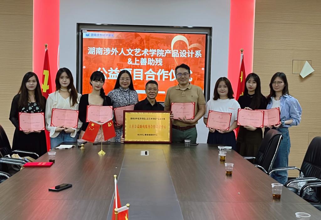 上善助残服务中心聘请人文艺术学院老师向威和黄玮为“上善助残爱心形象大使”。中心主任谢向前介绍,随着产品设计系的师生加入,相信上善的公益助残之路越来越宽广。