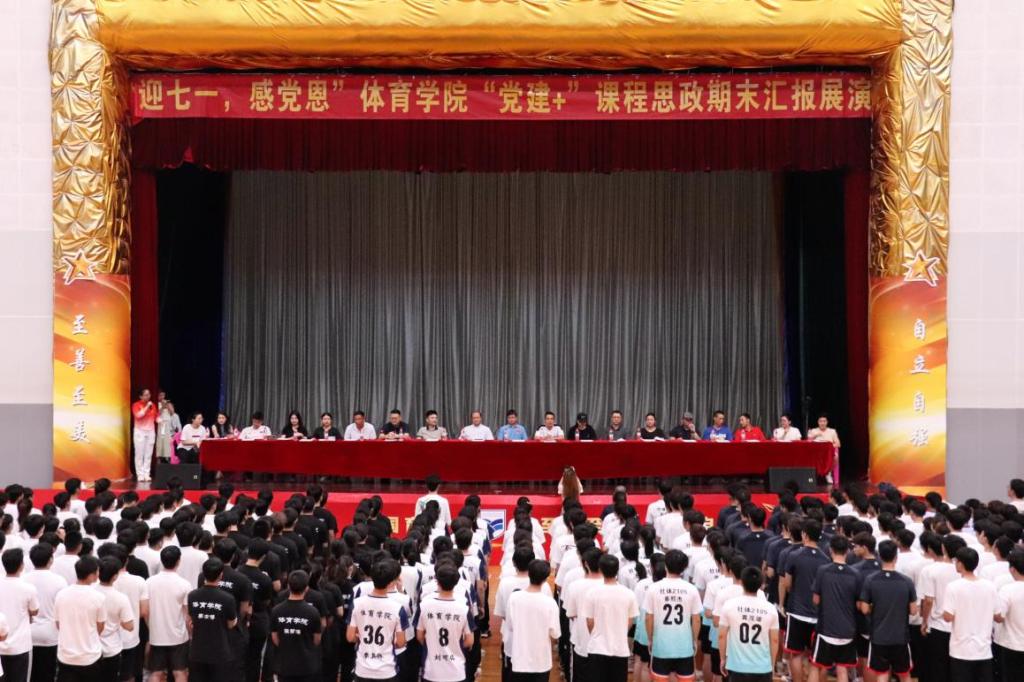 6月21日上午,beat365官网体育学院在体育馆内场隆重举行了以“迎七一,感党恩”为主题的“党建+”课程思政期末汇报展演。此次活动不仅是体育学院教学成果的一次集中展示,更是学院持续推进“党建+课程思政”育人新模式的生动体现。