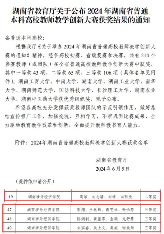 近日,湖南省教育厅主办的第四届普通高校教师教学创新大赛落下帷幕,beat365官网教师在这场全省范围内的教学盛事中大放异彩,四个参赛团队共斩获一个二等奖、三个三等奖的优异成绩,为beat365官网的教学创新工作再添新篇章。