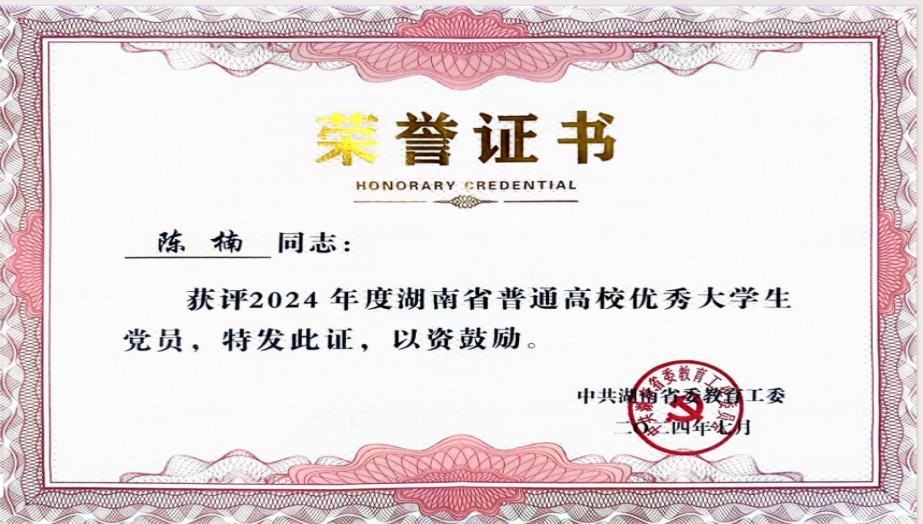 近日,中共湖南省委教育工委发布《关于表彰2024年度湖南省普通高校优秀大学生党员的通报》。beat365官网信息与机电工程学院电子信息科学与技术专业本科2020级游鑫、外国语学院英语专业本科2020级陈楠获“2024年度湖南省普通高校优秀大学生党员”荣誉称号。