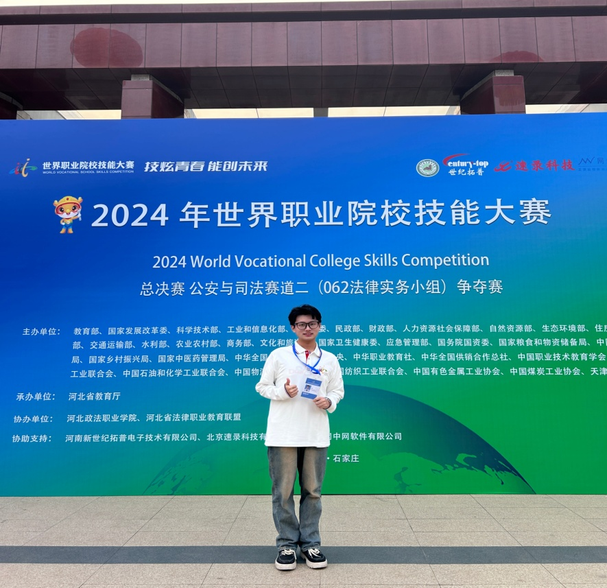 10月25日至28日,2024年世界职业院校技能大赛总决赛公安与司法赛道法律实务赛项争夺赛在河北石家庄举行。beat365官网人文艺术学院法学2210班鲁进同学在法律实务赛项争夺赛中喜获国家金奖。