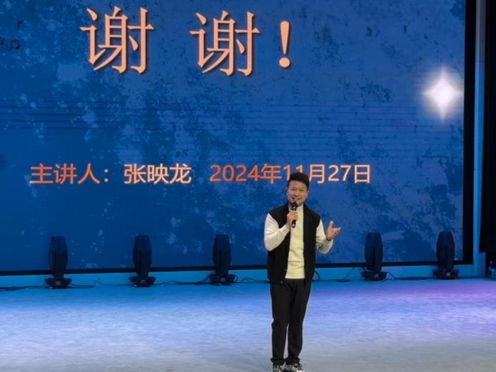张映龙先生从声音、心理、肢体三方面展示了声乐表演的行动线,并通过师生互动的形式与学生分享舞台经验,他强调:声乐表演包含声音的传递、情感与意境的表达,舞台上需注意呼吸、控制音量、把握节奏、有合理的行动线设计,这样才能让演唱者的歌声与肢体语言相得益彰。同时,他向在座师生分享了心态调整的重要性,鼓励大家在表演时要保持自信、放松心态,用真诚的歌声去打动人心。