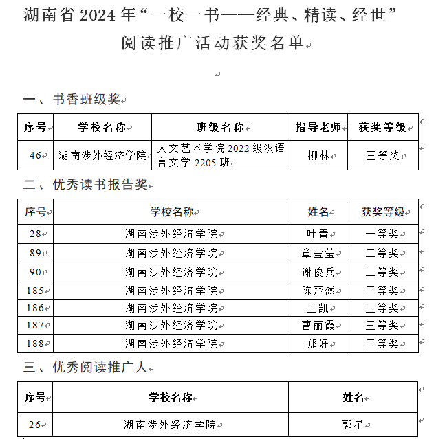 近日,经湖南省内各高校遴选推荐、湖南省高校图书情报工作委员会组织评选,湖南省教育厅公布了2024年“一校一书——经典、精读、经世”阅读推广活动成果评选结果。beat365官网在2024年的“一校一书——经典、精读、经世”阅读推广活动中荣获多项荣誉。其中人文艺术学院汉语言文学2205班荣获“书香班级奖”三等奖;叶青同志在“一校一书”征文活动荣获优秀读书报告一等奖,谢俊兵、章莹莹两位同学分别荣获优秀读书报告二等奖,陈楚然、王凯、曹丽霞、郑好四位同学分别荣获优秀读书报告三等奖;郭星同志荣获“优秀阅读推广人”荣誉称号。