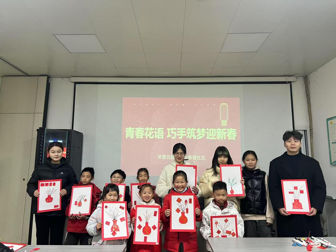 在芙蓉北路街道金泰路社区的“青春花语,巧手筑梦迎新春” 活动中,音乐学专业的彭玉成同学协助手工老师,指导小朋友制作手工年宵花,为社区增添了温馨的节日氛围。