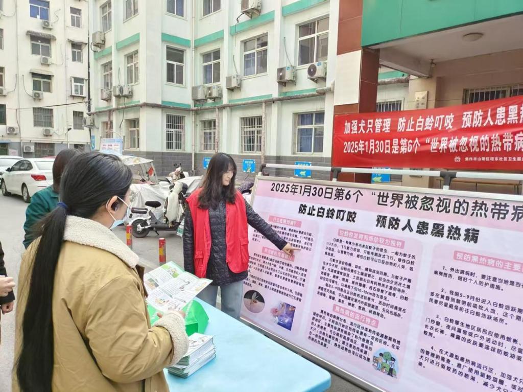 在焦作市山阳区塔东社区卫生服务站开展的“防止白蛉叮咬,预防人患黑热病” 活动中,音乐学专业的司佳鑫同学向社区居民耐心讲解黑热病的危害以及白蛉叮咬的预防方法,有效提升了居民的健康防护意识。