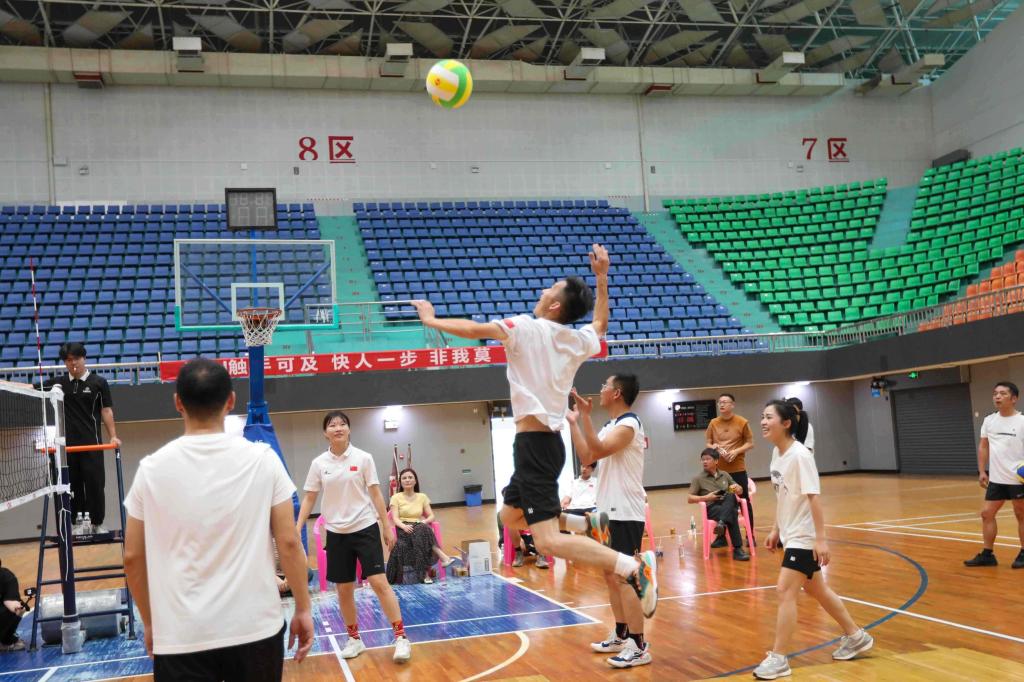 赛场上,平日里严谨治学的老师们瞬间化身运动健将,发球、起跳、扣杀、救球……每一个动作都展现出专业与激情。队员们默契配合,时而鱼跃救球,时而巧妙战术配合,欢呼声、呐喊声此起彼伏,现场气氛热闹非凡。