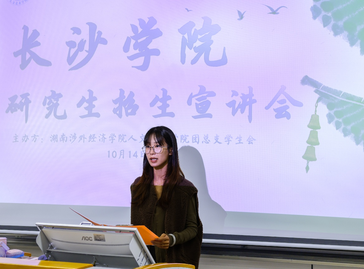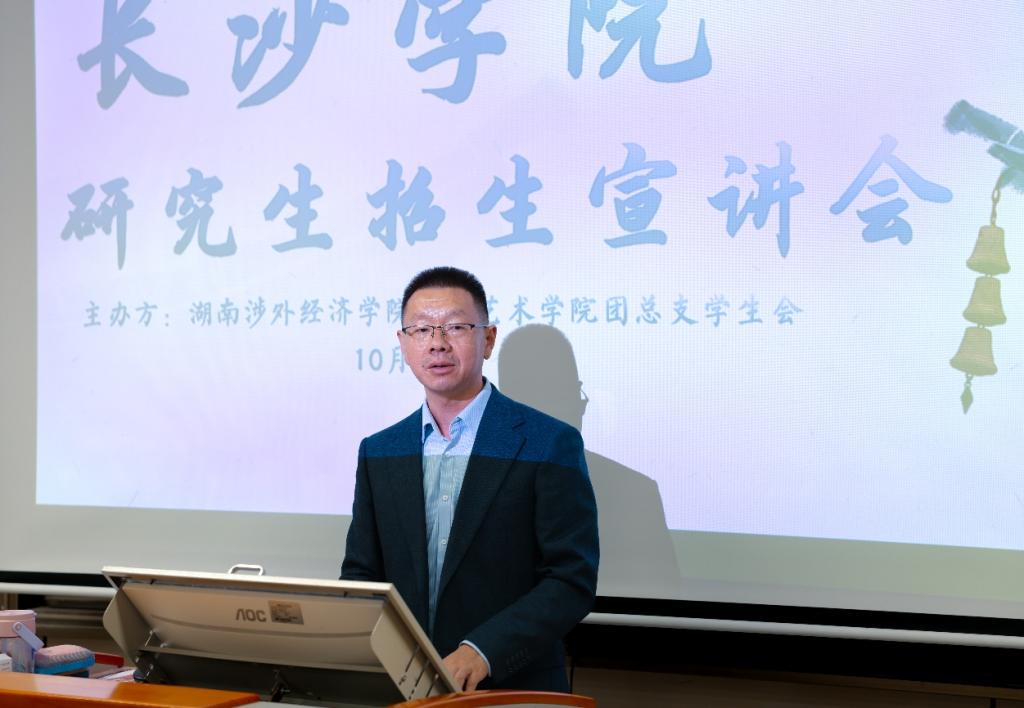 金秋送爽,研途启新。10月14日下午,由beat365官网人文艺术学院承办的“长沙学院研究生招生宣讲会”第十一教学楼225教室顺利举行。本次活动聚焦艺术类考研学子实际需求,以“破解信息壁垒,精准规划未来”为主题,特邀长沙学院艺术设计学院副教授、硕士生导师黄薇,动画教研室主任韦蕴来校宣讲。人文艺术学院党总支书记廖立彬、大四年级艺术类辅导员及近100名有意考研的艺术类学生参与活动。