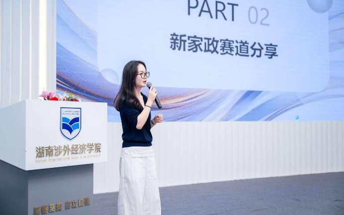 在主题分享环节,首位登场的湘江新区“岗位代言人-整理收纳师”谭慧敏以其95后创业者的独特视角,分享了从择业到投身“新型家政服务”赛道的转型故事。她通过个人生动的案例,介绍了整理收纳行业的发展前景与核心技能,为在场学生探索职业新赛道提供了全新思路。